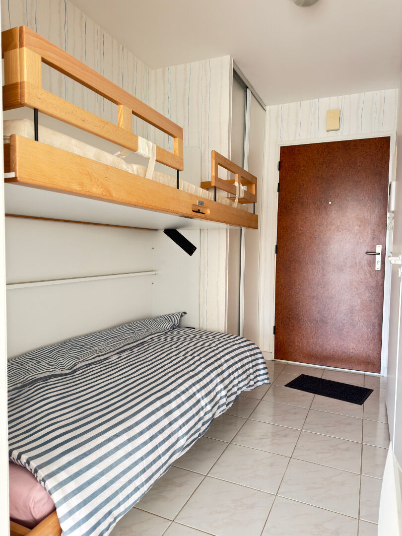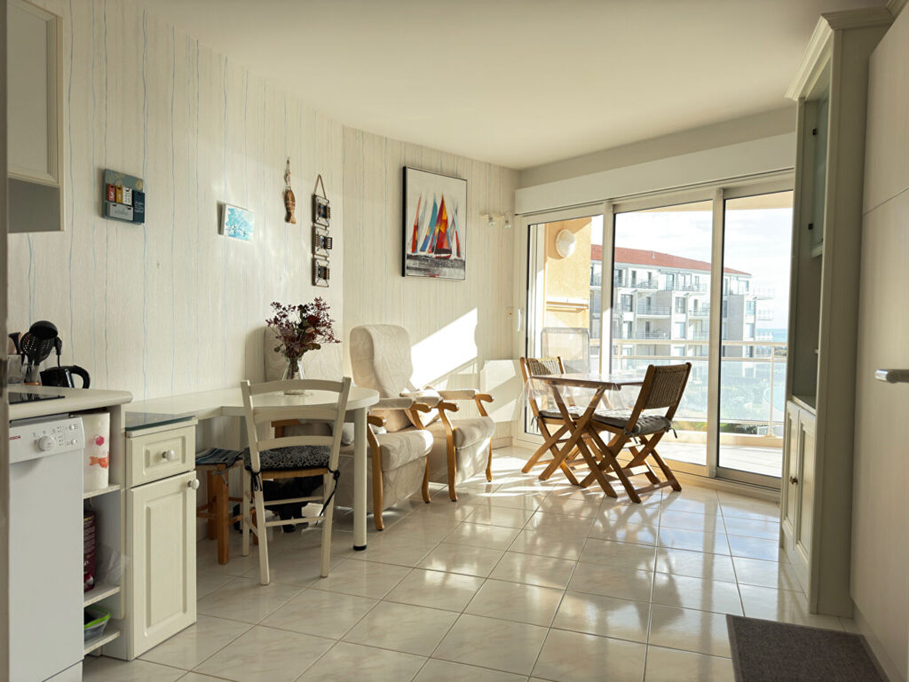 La Chaume, proche cote sauvage résidence Le Grand Bleu au 3 ème étage avec ascenseur, appartement type studio 4 couchages en parfait êtat comprenant : Entrée avec coin alcôve deux couchages, séjour avec coin cuisine équipée donnant sur balcon face mer et piscine plein sud, salle d’eau, wc.